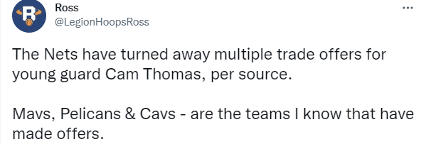 据美媒Legion Hoops报道,篮网已经拒绝多支球队对后卫卡梅隆-托马斯的交易报价;这些球队中包括了独行侠鹈鹕骑士