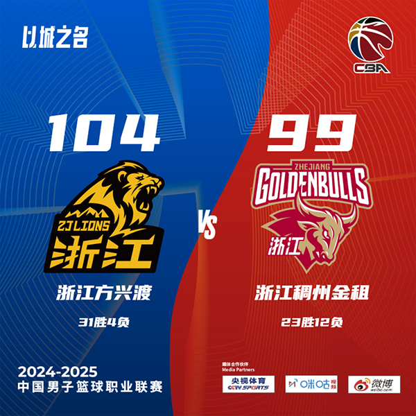 24直播网讯 北京时间1月25日讯 CBA常规赛迎来春节前最后一轮,领头羊广厦主场迎来与浙江的同省德比,广厦豪取11连胜,30胜4负强势领跑,浙江3连胜后战绩来到23胜11负,暂列联赛第6位。此役一上来浙江率先进入状态,内外结合轰出13-2梦幻开局,胡金秋联手布朗迅速回敬11-0攻击波,广厦立刻抹平分差,随后两队你来我往比分紧咬,首节结束时浙江领先2分,次节回来,浙江进攻断电单节仅得到14分,广厦延续火力一举反超,半场战罢,广厦确立12分优势。短暂休整后双方击鼓再战,浙江多点开花缩小分差,末段广厦及时复苏稳住局势,三节结束后广厦保有4分优势,末节上来,浙江一波9-0拉回悬念,孙铭徽关键三分一剑封喉,最终广厦104-99力克对手迎来12连胜。