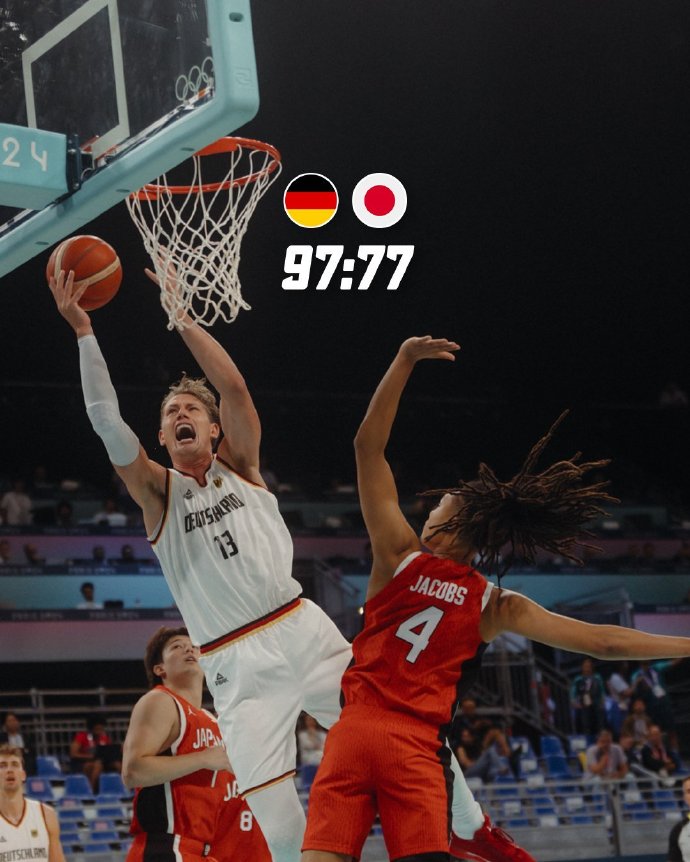 24直播网讯 7月27日讯 奥运男篮小组赛B组,德国对阵日本。开场后施罗德和泰斯两人联手带领德国建立领先,日本则连续命中三分将比分咬住。第二节德国有内有外一度建立起16分优势,河村勇辉和八村塁又帮助日本稳住阵脚将分差拉回个位数。易边再战,德国多点开花再次打出攻势将分差拉开,第四节日本也无力缩小分差,最终德国97-77轻松击败日本取得开门红。