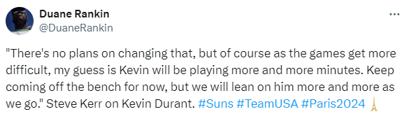 巴黎奥运男篮小组赛已经全部结束,美国男篮三战全胜且三战净胜64分成为头号种子,他们将在1/4决赛对阵巴西男篮;美国队会在淘汰赛安排杜兰特首发吗?主教练科尔表示:我们没有计划改变这一点(杜兰特替补),但当然,随着比赛变得越来越困难,我猜他的出场时间会越来越多。他现在会继续打替补,但随着比赛的进行,我们会越来越依赖他。