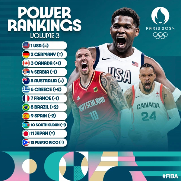 FIBA官方更新奥运会男篮战力榜,美国、德国继续排名前二,加拿大升至第三,东道主法国降至第7;具体排名——1、美国;2、德国;3、加拿大;4、塞尔维亚;5、澳大利亚;6、希腊 ;7、法国 ;8、巴西;9、西班牙 下降两位;10、南苏丹 下降一位;11、日本;12、波多黎各。