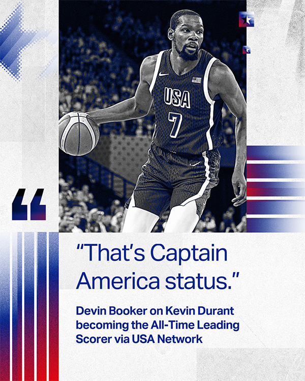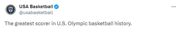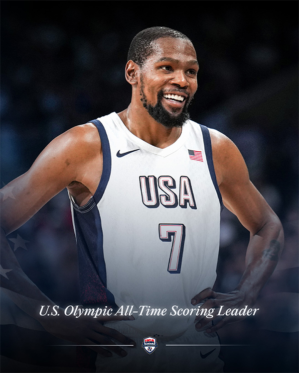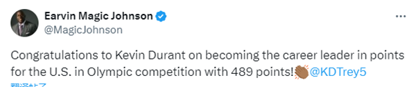 美国男篮官方祝贺杜兰特成为美国奥运篮球史上最伟大的得分手。