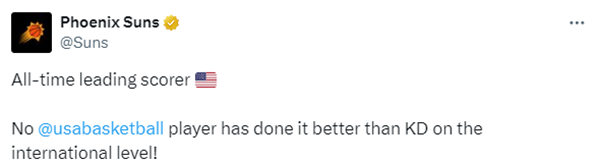 太阳官方祝贺杜兰特成为美国篮球奥运历史得分王,在国际赛场上,没有一位美国篮球队成员比KD做得更好。