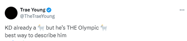 老鹰球星特雷-杨夸赞杜兰特:KD早已是GOAT,他更是奥林匹克的GOAT,这是描述他的最好方式。湖人名宿魔术师约翰逊也祝贺杜兰特。