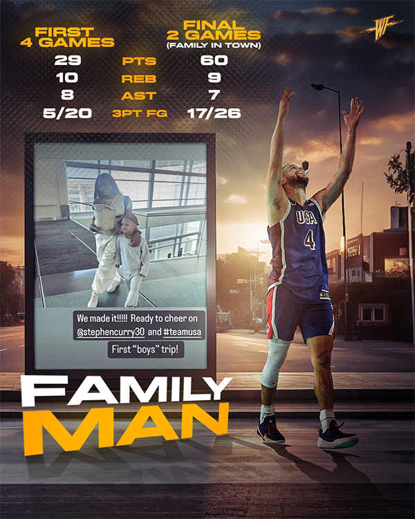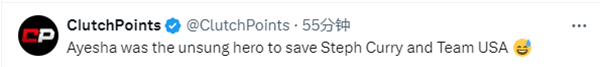 美媒ClutchPoints晒图,阿耶莎来到巴黎前,库里场均只拿到7.3分,而且4场比赛总共投进5记三分;阿耶莎来到巴黎后,库里场均30分,2场比赛总共投进17记三分,配文调侃:阿耶莎是拯救斯蒂芬·库里和美国队的无名英雄。