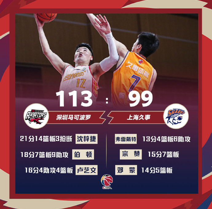 24直播网4月5日讯 今日CBA常规赛,深圳迎战上海。深圳排名积分榜第8,上海最近遭遇两连败,22胜27负排名积分榜第13。比赛开始,上海首先发力取得6分领先,随后于梁里突外投连续拿分替深圳缩小分差,首节结束时,上海23-22仅领先深圳1分。次节上来,双方比分依旧胶着,上海抓住深圳失误一度领先5分,深圳快速调整后始终紧咬比分不放。易边再战,卢艺文外线爆发连中3记三分,上海进攻效率降低,深圳不断扩大领先优势,三节结束,深圳84-74领先上海10分。末节上来,上海打出一波8-3将分差缩小至只剩5分,但之后深圳里突外投接连得手,一度将分差扩大至16分,比赛随即失去悬念。最终,深圳113-99战胜上海。