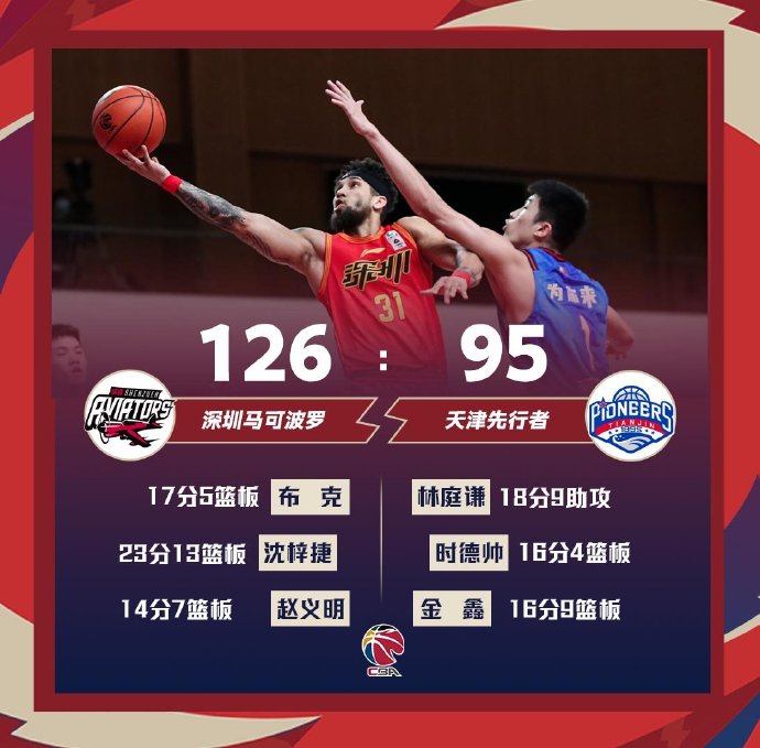 深圳(20-17):沈梓捷23分13板4帽,卢艺文12分7板3助2断,布克17分5板3助3断,顾全13分3助,贺希宁12分7板5助2帽,伯顿14分6助,赵义明14分7板,卢鹏宇6分4助,白昊天6分