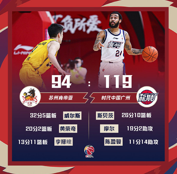 广州(13-18):斯佩茨26分10篮板4助攻,陈盈骏11分4篮板14助攻,郭凯14分6篮板,李炎哲11分5篮板,摩尔19分,贾明儒10分5助攻,田宇恒9分3篮板2助攻,郑准9分5篮板