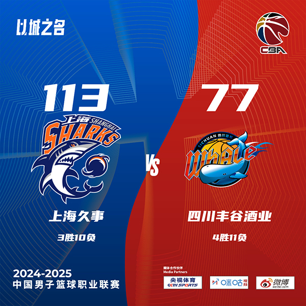 24直播网讯北京时间12月8日讯 CBA常规赛继续进行,上海主场迎战四川,上海上场大胜浙江,卢伟迎来执教球队后常规赛首胜,但上海目前2胜10负仅排在倒数第二,四川近期遭遇连败,4胜10负排在联赛第16位,此役四川外援萨姆纳伤缺两场后复出。首节开打后双方互相试探比分紧咬,王哲林杀伤内线不断取分,四川双外援萨姆纳和亨特联手回应,李添荣火力全开单节独得14分,上海率先发力拉开比分,首节结束时上海确立15分优势,次节回来,上海进攻火力放缓,但四川国内球员状态低迷,仅有李金效连中三分,萨姆纳和亨特苦苦支撑,半场战罢,上海继续领先17分。易边再战后四川进攻彻底哑火,单节仅得到10分,上海多点开花将分差越拉越大,三节结束后上海已经领先35分,末节上来,上海派上替补阵容,四川难以打出追分高潮,比赛提前失去悬念,最终上海113-77大胜四川迎来本赛季首次连胜。