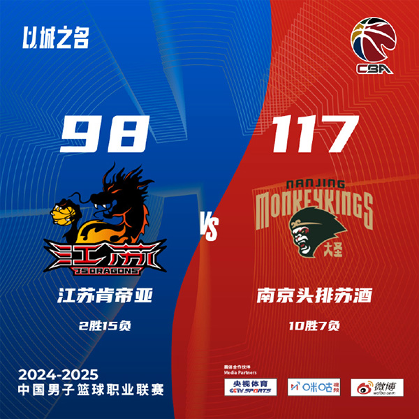 24直播网讯2024年12月14日讯 CBA常规赛,江苏和同曦迎来德比。江苏目前2胜14负,同曦9胜7负。一开场,双方势均力敌,比分始终紧咬,江苏不断冲击内线频频得手,同曦内外开花迅速回应,次节同曦占得先机,此后却突然哑火,江苏轰出17-0强势反超,郭昊文高效发挥带队追赶,半场战罢双方战成60平。下半场,郭昊文延续火力,得分助攻一肩挑带队将分差拉开到两位数,末节林葳连中三分将分差拉开到20分,江苏大势已去无力回天。最终,同曦117-98击败江苏,赢下德比。