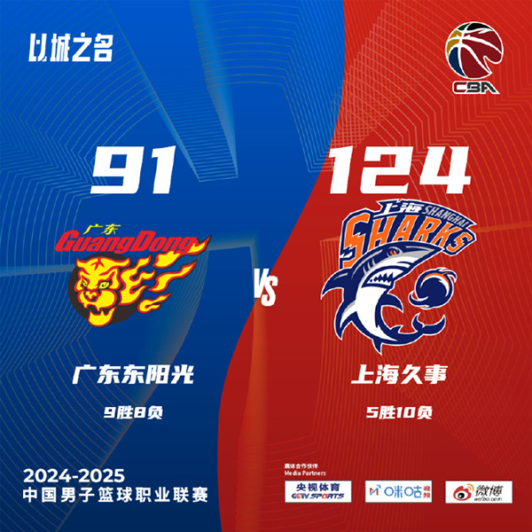 24直播网讯2024年12月14日讯 CBA常规赛,广东今日迎战上海,前者近来取得两连胜,后者则是三连胜,并且三场赢了101分。比赛上来,广东率先进入状态打出7-0的完美开局,但上海此后及时调整追了回来,首节后半段广东更是陷入到得分荒,上海轰出一波11-0取得领先,次节广东的情况依旧没有好转,除了徐杰和吉伦沃特其他人难有发挥,分差也是被扩大到二十分以上,半场结束时上海领先19分;下半场回来,广东的命中率有所提升,但依旧无法限制对手的攻势,上海连续第三节单节得分破30分,分差也是一直保持在二十分左右,比赛在末节早已失去悬念,最终上海大胜广东迎来四连胜。