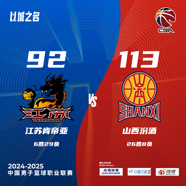 24直播网讯 北京时间1月25日讯 CBA常规赛,江苏对阵山西,江苏上场比赛击败天津结束6连败,山西上场比赛被同曦终结连胜势头。开场后刘传兴多次打内线得手,江苏靠着两名外援的发挥后来居上,两队经过一段混战后,山西队的古德温连续冲击内线追平比分。两队首节都犯规颇多,第二节上来山西依旧多次强攻篮下拿分,贾明儒外线手感火热接连三分命中将领先优势扩大,江苏队靠着外援的发挥努力追分,但全面开花的山西在半场结束时依旧手握15分优势。易边再战,汤普森面对刘传兴多次在中距离投篮命中,不过山西进攻发挥稳定始终保持两位数优势,张宁内突外投接连拿分。最后一节张宁延续状态频频杀入内线帮助山西将分差拉大到20分以上,比赛失去悬念,最终山西113-92轻松击败江苏。
