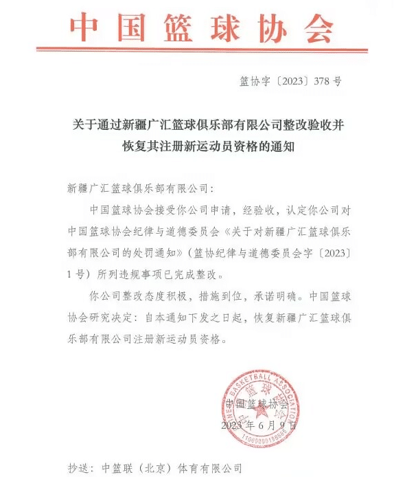 来源:24直播网06-09 11:0424直播网06月09日,中国篮协官方宣布恢复新疆男篮的注册新运动员资格,此前的处罚被撤销,原因是“所列违规事项已完成整改,整改态度积极,措施到位,承诺明确”,所以决定恢复新疆男篮注册新运动员的资格。