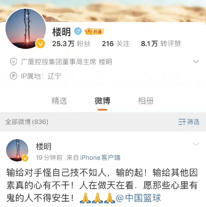 不过这比赛最重要的还是第四节,广厦男篮开始追分的时候,裁判接连的吹罚,让他们的追分高潮就此中断,他们最终也无缘逆转,广厦男篮最终也是被淘汰出局。而在广厦被淘汰出局后,广厦的老总也是在社交媒体上发文表示:“输给对手怪自己技不如人,输得起!输给其他因素真的心有不甘!人在做天在看,愿那些心里有鬼的人不得安生。@中国篮球”显然楼明的言下之意是这球是假球,有问题。
