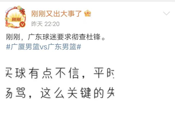 接下来,我们再来说说广东男篮这边,在输给浙江干啥后,杜锋指导也是受到了很多球迷的质疑,很多球迷质疑杜锋指导有猫腻,为什么呢?球迷列举出了几个例子,比如说在第四节,杜锋指导一度长时间弃用了表现最好的胡明轩。而那时候的胡明轩身上明明没有犯规的麻烦了,为什么杜锋指导弃用呢?同时拥有数十万粉丝的媒体人“刚刚又出大事了”也是爆料,球迷质疑杜锋买球,因为平时一个失误,杜锋都要冲进场内骂,关键时刻的失误一点反应没有。