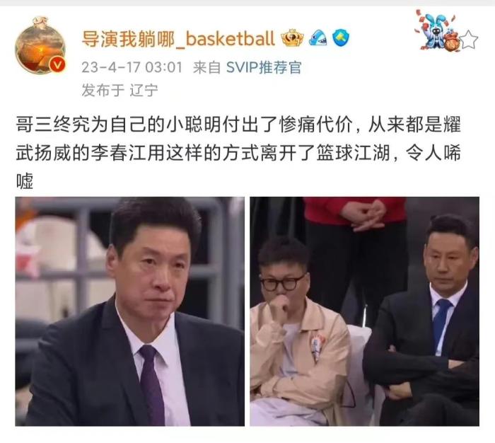 从“导演我躺那”的爆料,我们可以了解到,李春江大概率是要被重罚禁赛,否则他不会用李春江以这样的方式离开篮球江湖来形容。而李春江如果被罚,闹剧的主角江苏男篮的主教练李楠也是难逃其中。哪怕这场比赛的走势不是李楠想要的,但是作为主教练李楠放任了,李楠就要负责,所以李楠大概率要告别CBA了。