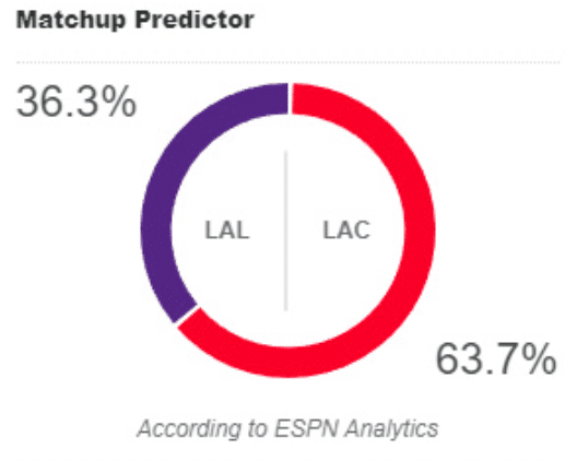 外媒看衰湖人对阵快船的前景,ESPN给出的明天洛城德比胜率,湖人的胜率只有36.3%、快船则高达63.7%。快船已经休息多日,而湖人刚刚在客场与爵士鏖战到了加时赛,确实体能层面,快船是占据明显优势的。