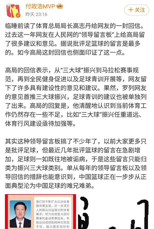特别是在近期,CBA全明星周末的第一个比赛日,18000人的体育馆只来了900人,更是有无数的球迷要求姚明下课。球迷要求姚明下课如今的呼声有多大呢?近期,名记付政浩报道近期,总局局长高志丹回给球迷的一份信,据悉,球迷的去信批评中国篮球的声音非常的多,这也让高局在回信的时候点名了男篮和篮协,高局也表示他清醒的认识到当前体育工作中存在一些不足,比如说“三大球”振兴任重道远、体育行风建设等等。