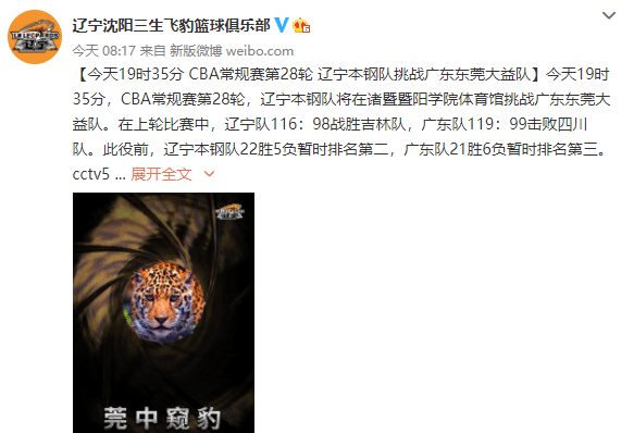 辽篮和广东已经在社交媒体上针对这场“辽粤二番战”进行预热,CCTV5也将会直播,辽宁本钢队22胜5负暂时排名第二,广东队21胜6负暂时排名第三,期待两队接下来的表现。