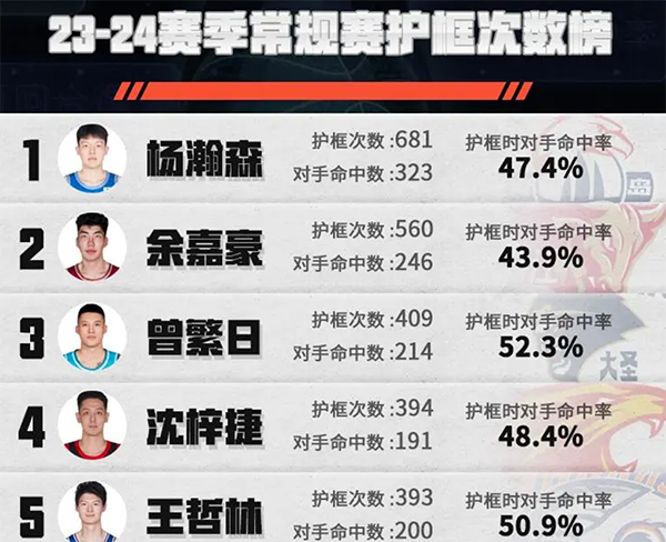 翻看下杨瀚森本赛季常规赛的防守数据,他是常规赛护框次数最多的本土球员,且护框次数断崖式领先全联盟,而在他护框时,对手命中率为47.4%,这在护框总次数前20的球员里,也是第5低的。