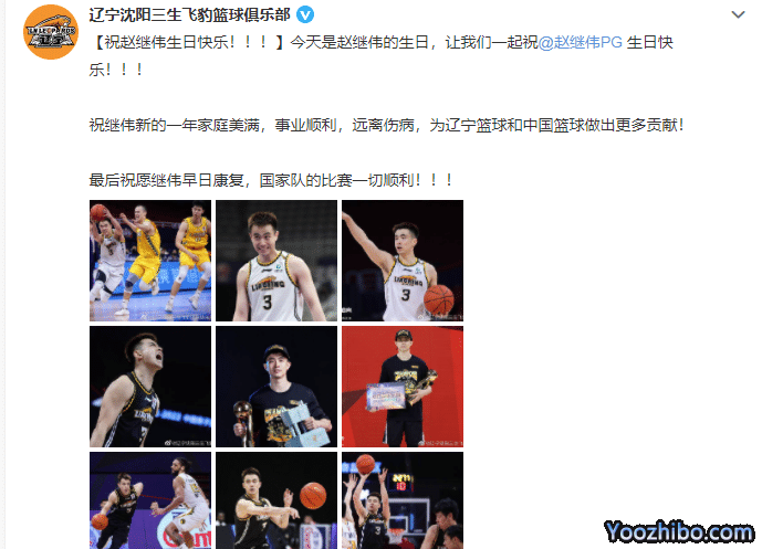 辽篮官方也送上了祝福,晒出了赵继伟在辽篮重要时期的九宫格照片,同时配文:“【祝赵继伟生日快乐!!!】今天是赵继伟的生日,让我们一起祝赵继伟生日快乐!!!祝继伟新的一年家庭美满,事业顺利,远离伤病,为辽宁篮球和中国篮球做出更多贡献!最后祝愿继伟早日康复,国家队的比赛一切顺利!!! ”