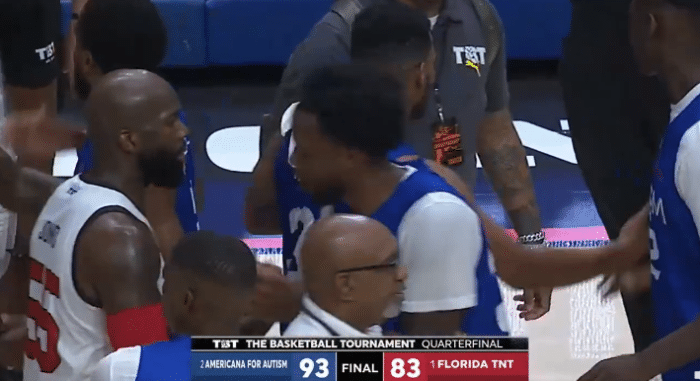 这是TBT联赛联赛佛罗里达队以83-93不敌Americana for Autism,止步八强。比赛最后时刻,对手投进了锁定胜局的三分球,开始疯狂庆祝,琼斯和伯顿都非常无奈,但随后还是和对手击掌、拥抱致意。这场比赛多米尼克-琼斯砍下22分5篮板4助攻,肯尼-伯顿16分4篮板,这两大CBA外援合砍38分,可惜球队依旧输球,被淘汰出局,无缘四强。