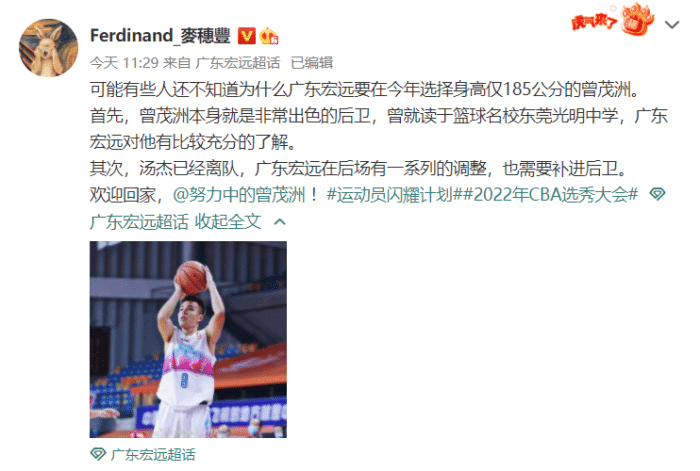 用首轮第17顺位选中来自清华大学的曾茂洲,后者今年25岁,身高1米85,体重82公斤,司职后卫。