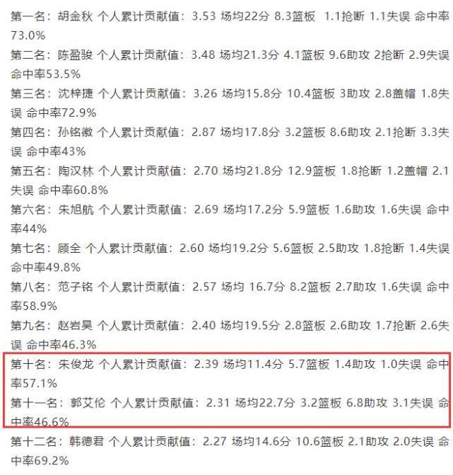 为何场均23.3分的郭艾伦排名会如此之低呢?最重要的还是CBA的计算公示,这也让郭艾伦的贡献值还不如浙江广厦的朱俊龙,毕竟朱俊龙的排名在第10位,显然这样的结果很难让球迷满意,我们也期待CBA能够对不科学的规则进行调整。