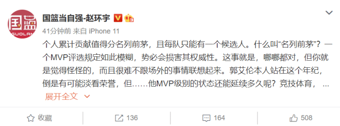 媒体人赵环宇“个人累计贡献值得分名列前茅,且每队只能有一个候选人。什么叫“名列前茅”?一个MVP评选规定如此模糊,势必会损害其权威性。这事就是,哪哪都对,但你就是觉得怪怪的,而且很难不跟场外的事情联想起来。郭艾伦本人站在这个年纪,倒是有可能淡看荣誉,但……他MVP级别的状态还能延续多久呢?竞技体育,真的好残酷。”