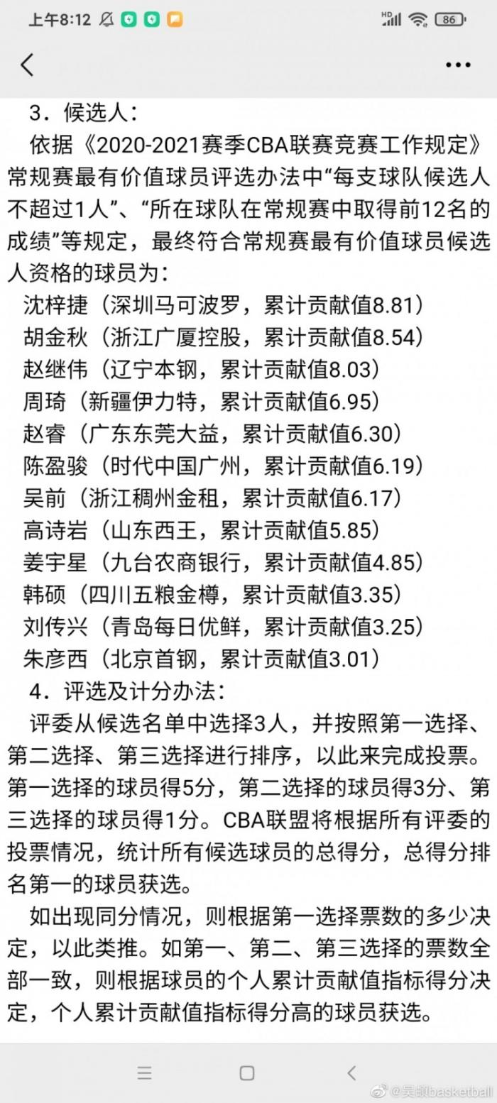 并且还有附加的两条每支球队候选人不超过1人”、“所在球队在常规赛中取得前12名的成绩"等规定。周琦、胡金秋、吴前等人入选没有什么问题,因为他们的表现有目共睹,也都是各自球队的当家球星!以球迷的角度来说,MVP的标准应该是个人数据出色、对球队贡献值高,球队战绩排在前列。