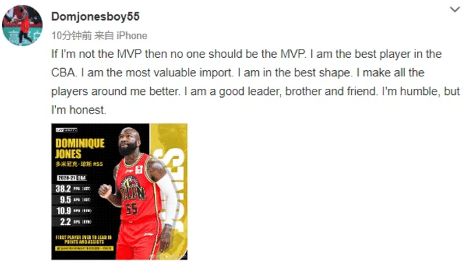 可以看出琼斯的数据是很炸裂的同时他场均篮板虽然不是第一,但也有场均10.9个篮板,等于是赛季场均三双的数据,就连琼斯本人都在社交媒体上呼吁自己才是最有价值球员,但可惜的是琼斯并不符合入选CBA的规则。