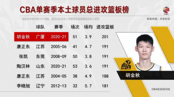 胡金秋本赛季常规赛摘下了201个进攻篮板,成为历史上单赛季进攻篮板王,他场均可以摘下3.9个进攻篮板,给广厦带来了每场接近4次的二次进攻机会。