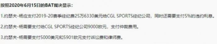 据悉,约瑟夫杨是与此前的经纪公司CGL SPORTS(申请人)产生纠纷,他现在的经纪公司是YM APAA Sports。