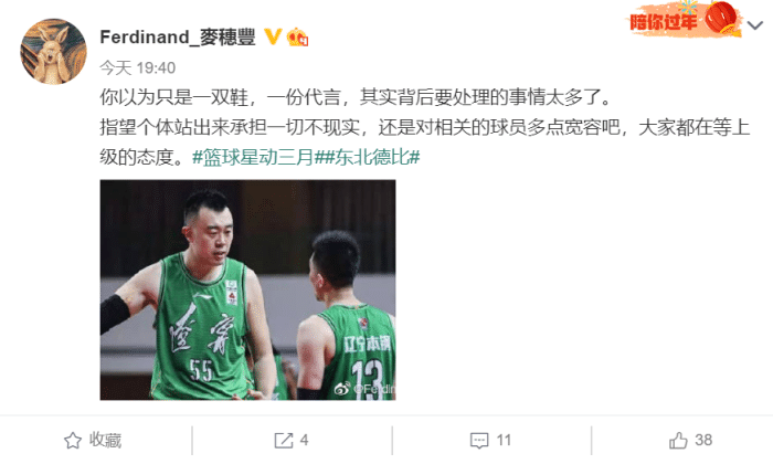 他表示“你以为只是一双鞋,一份代言,其实背后要处理的事情太多了。指望个体站出来承担一切不现实,还是对相关的球员多点宽容吧,大家都在等上级的态度。#篮球星动三月##东北德比#”其实事实就是这样,体育圈和娱乐圈不一样,CBA球员基本都是体制内,不只是个人行为。