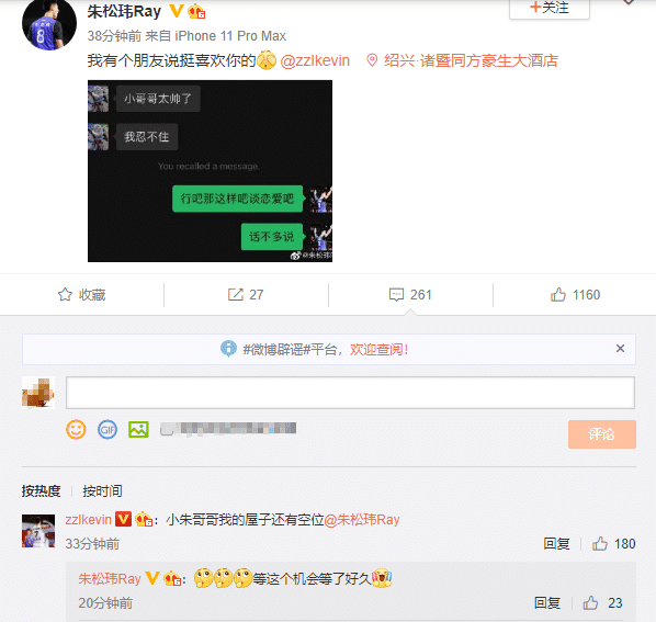 就在今天晚上,四川男篮球员朱松玮在社交媒体上晒出一张聊天纪录,内容是一个好友表示很喜欢张镇麟,还直言“忍不住了”,朱松玮回应到“话不多说,谈恋爱吧”然后朱松玮就在社交媒体上提到了张镇麟,称:“我有个朋友说挺喜欢你的”