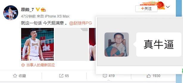 比赛结束之后的新闻发布会,原帅感谢了队友的传球。下场之后,原帅更新社交媒体,他配的图片是自己和赵继伟,然后中间一张是赵继伟发来了的祝贺“真牛”,随后原帅配文:“就这一句话 今天挺满意 。@赵继伟PG ”