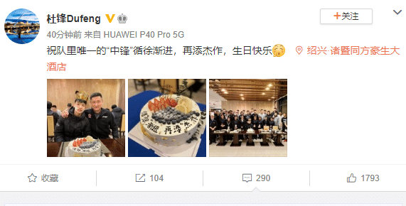 就在今天晚上,广东男篮主帅杜锋在社交媒体上给徐杰送上了祝福:“祝队里唯一的“中锋”循徐渐进,再添杰作,生日快乐。”同时杜锋还晒出了多张徐杰庆生的照片,其中不乏包括全队包括工作人员和徐杰的大合影。