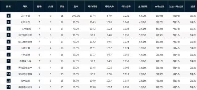 CBA第一阶段排名:辽篮全胜 北京首钢第2