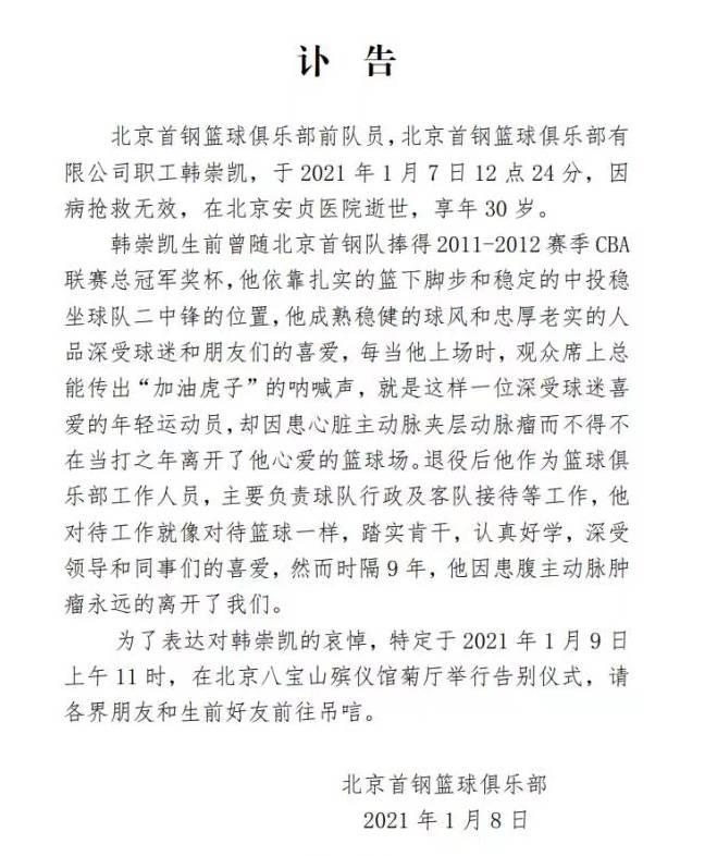 来源:24直播网01-08 21:0124直播网1月8日讯 北京时间1月8日,篮坛传出了一个不幸的消息,北京男篮前球员韩崇凯因病去世,年仅30岁。随后,北京男篮官方社交媒体发布了讣告。