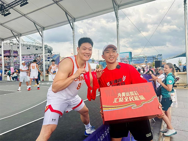 “我们专门带了国旗、助威标语牌,以及全国各地球迷准备的战马能量礼盒,有08奥运男篮国手们的签名篮球,中国文艺志愿者协会副主席何加林老师手绘的‘马到成功’骏马图,村BA球员手绣的球袜,战马篮徒定制球衣,还有为他们补充能量的战马饮料。这个在2024战马能量之夜活动上汇聚而成,集结了各方祝福的战马能量礼盒,跨越万里从国内送到巴黎,为的就是让中国健儿能够在异国他乡,看到我们中国人的助威能量。”战马能量观赛团代表王翔在奥运三人男篮比赛现场亲手赠送给国手张宁时兴奋的介绍道。