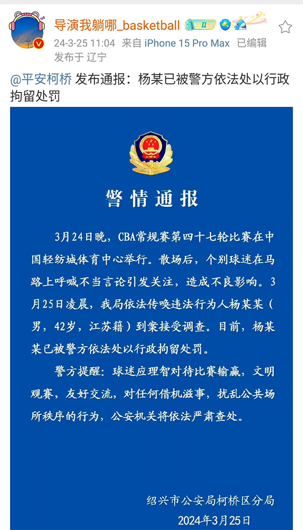 在这个事情上了热搜之后,不得不说,当地警方还是非常的高效的,根据知名篮球媒体人“导演我躺那”的报道,在事发后,“平安柯桥”发布了通报表示,在CBA第四十七轮比赛三场后,个别球迷在马路上呼喊不当言论引发关注,造成不良影响,3月25日凌晨,绍兴市柯桥区分居已经依法传唤违法行为人杨某某(42岁,江苏籍)接受调查,目前,杨某已被依法处于行政拘留处罚。