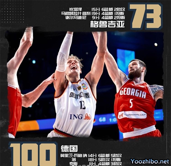 24直播网9月1日讯 男篮世界杯16强小组赛,德国对阵格鲁吉亚。德国E组第一,格鲁吉亚F组第二。比赛开始,双方很快进入状态,德国强攻内线连投带罚拿分,格鲁吉亚内外开花给出回应,德国突然发力完成13-2的攻击波取得领先,次节双方继续缠斗,德国外线开火连中三分,格鲁吉亚回敬9-1扳平比分,半场战罢德国43-41领先2分。易边再战,施罗德得分助攻一肩挑,率领德国连中三分轰出11-0的攻势一举确立两位数优势,格鲁吉亚强攻内线拿分苦苦追赶,但末节德国再度发力打出12-3的攻击波将分差拉开到20分以上,比赛失去悬念。最终,德国轻取格鲁吉亚。