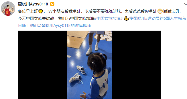 女篮冲击世界杯四强,男篮国手送来祝福,中国男篮球员、北京首钢队长翟晓川在社交媒体上晒出与孩子一起训练的内容,配文:今天中国女篮关键战,我们为中国女篮加油。