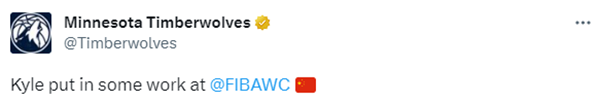 森林狼官推晒出李凯尔对阵菲律宾的数据,配文写道:李凯尔在男篮世界杯上履行了职责(中国国旗)。