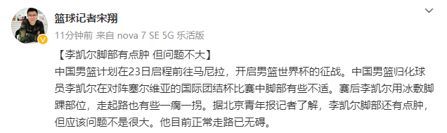 李凯尔伤情更新:脚仍有点肿但已无碍 转发12人名单高呼中国队加油