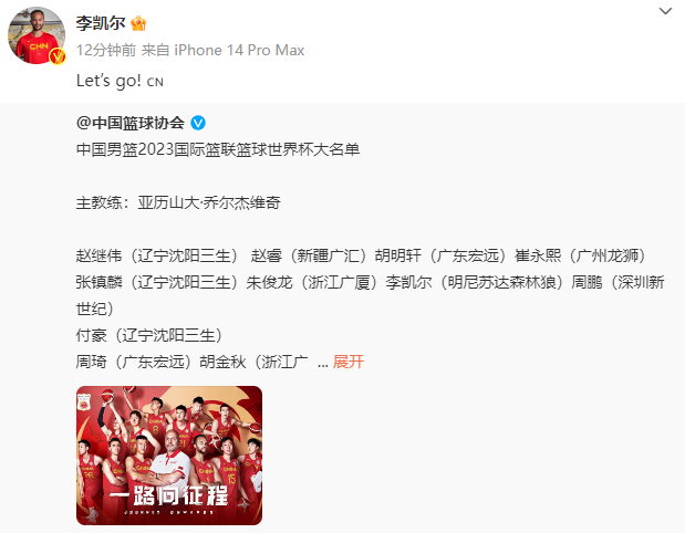 李凯尔第一时间转发中国篮协动态,并且配文写道:让我们冲啊!中国队!