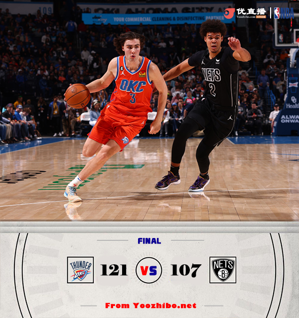 24直播网3月15日讯 NBA常规赛继续进行,雷霆主场迎战篮网,两队此前均取得两连胜,雷霆33胜35负排名西部第十一,篮网则是39胜29负位列东部第五。比赛开局,雷霆率先发力,打出一波7-0的小高潮,但随后进攻端断电,篮网则找到进攻状态,反超并建立两位数的领先优势。次节两队交替取分,分差在十分上下浮动,半场结束篮网62-52领先。易边再战,场上形势风云突变,雷霆外线连续投中,篮网则运动战连连失准,雷霆单节打出38-20,逐渐反超并领先到8分进入第四节。末节上来,雷霆稳扎稳打维持差距,篮网没能再追上比分,最终雷霆121-107逆转战胜篮网,取得三连胜。