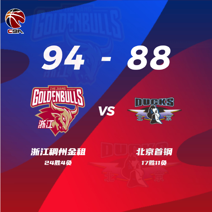 24直播网1月18日讯 CBA常规赛第二阶段进入尾声,浙江对阵北京,浙江目前23胜4负高居积分榜榜首,而北京最近状态不佳,3连败后17胜10负排在第6位。上半场双方命中率并不是很高,浙江队吴前手感不佳,但好在其余队友能给予进攻端的帮助,而北京队更是不在状态,首节只拿到16分,次节依靠约翰逊的强打北京一度反超比分,但浙江迅速调整,多点开花都能得分还是稳住领先。下半场,双方进攻端终于有起色,方硕、曾凡博联手翟晓川砍下18分帮助北京直接追平比分,随后双方命中率又有回落,但是展开胶着拉锯战,浙江通过外线三分重新反超并拉开比分,吴前连续失误又给北京机会,好在摩西-赖特关键抛投打进后又快下暴扣锁定胜局,最终浙江94-88力克北京,拿到3连胜的同时送对手4连败。