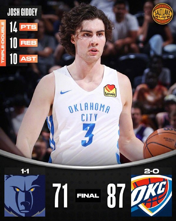 24直播网讯 7月7日讯 NBA犹他夏季联赛继续进行,雷霆对阵灰熊。昨天的比赛里,新科榜眼霍姆格伦的首秀非常精彩,他也带队大获全胜,灰熊则是全民皆兵险胜76人。一开场,灰熊连中三分取得领先,雷霆内外开花打出11-0的攻击波后灰熊回敬10-2的小高潮,双方20平结束首节。次节上来,雷霆多点开花取得领先,灰熊一波9-2一度反超,基迪和霍姆格伦联手拿到10分帮助雷霆以48-43领先结束上半场。易边再战,雷霆牢牢占据场上主动,再度轰出10-0的攻击波,三节打完雷霆领先15分。第四节,灰熊展开反击努力缩小分差,基迪带队稳住局势并将优势保持到了最后,最终,雷霆轻取灰熊,取得2连胜。