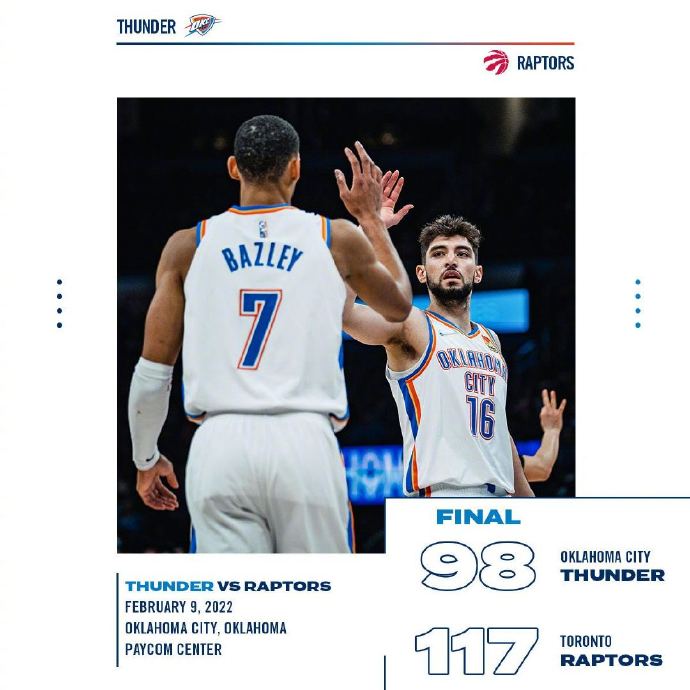 雷霆(17-37):基迪13分9篮板6助攻,多特15分4篮板4助攻,贝兹利13分4篮板2助攻2抢断,杰罗姆13分3篮板4助攻,肯威6分12篮板6助攻,马勒登18分2篮板3助攻,波库舍夫斯基18分4篮板4抢断2封盖
